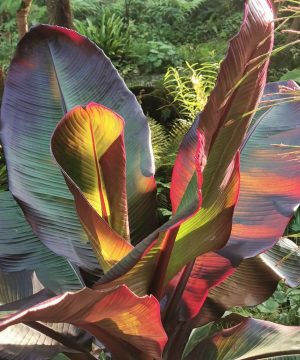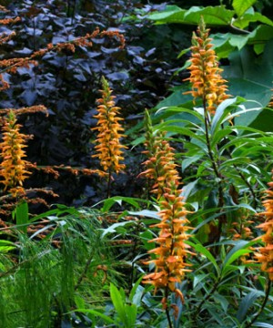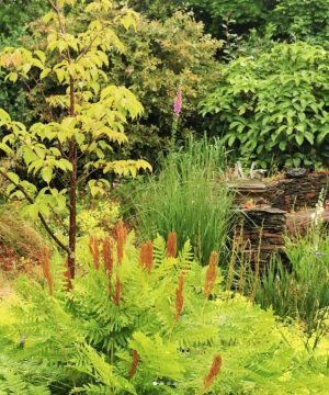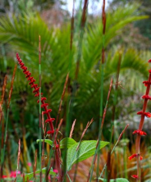 The planted borders are intensely rich in rare and unusual plants. Interesting associations include Tetrapanax, Baloskion tetrathyllum (Restio from Australia), Dicksonias, Cannas, Arbutus, Musas and Hedychiums. The strength of the exotic planting comes to the fore when summer progresses into Autumn.